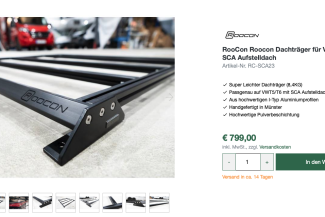 Ich habe auf einem Event Pitty kennengelernt. Pitty hat die kleine aber feine Firma Roocon Roof Rocks aus Münster auf die Beine gestellt. Die Manufaktur baut superleichte und dezente Dachträger für VW-Busse mit und ohne Aufstelldach und hat natürlich (je nach Kundenwunsch) auch andere Träger im Portfolio. Ich war sofort sehr begeistert von seinem Konzept und hatte endlich eine Alternative zu unserem guten aber zu schweren Frontrunner Dachträger für unser SCA-Aufstelldach.